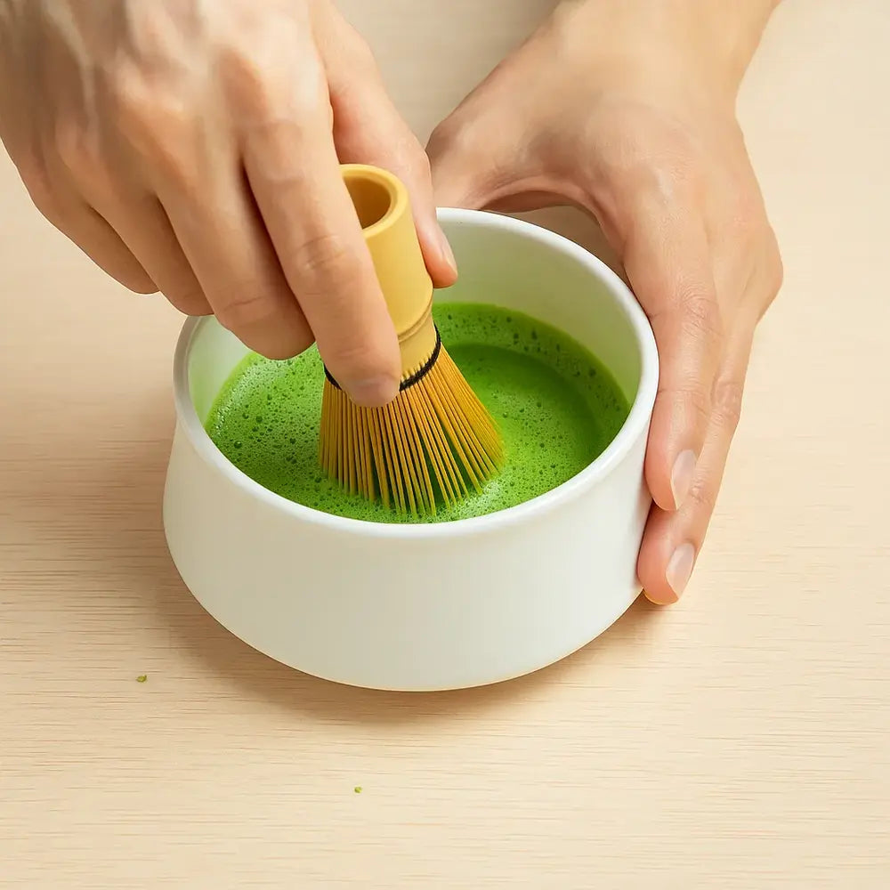 - Whisk vigorously in a zigzag motion with a matcha whisk until frothy